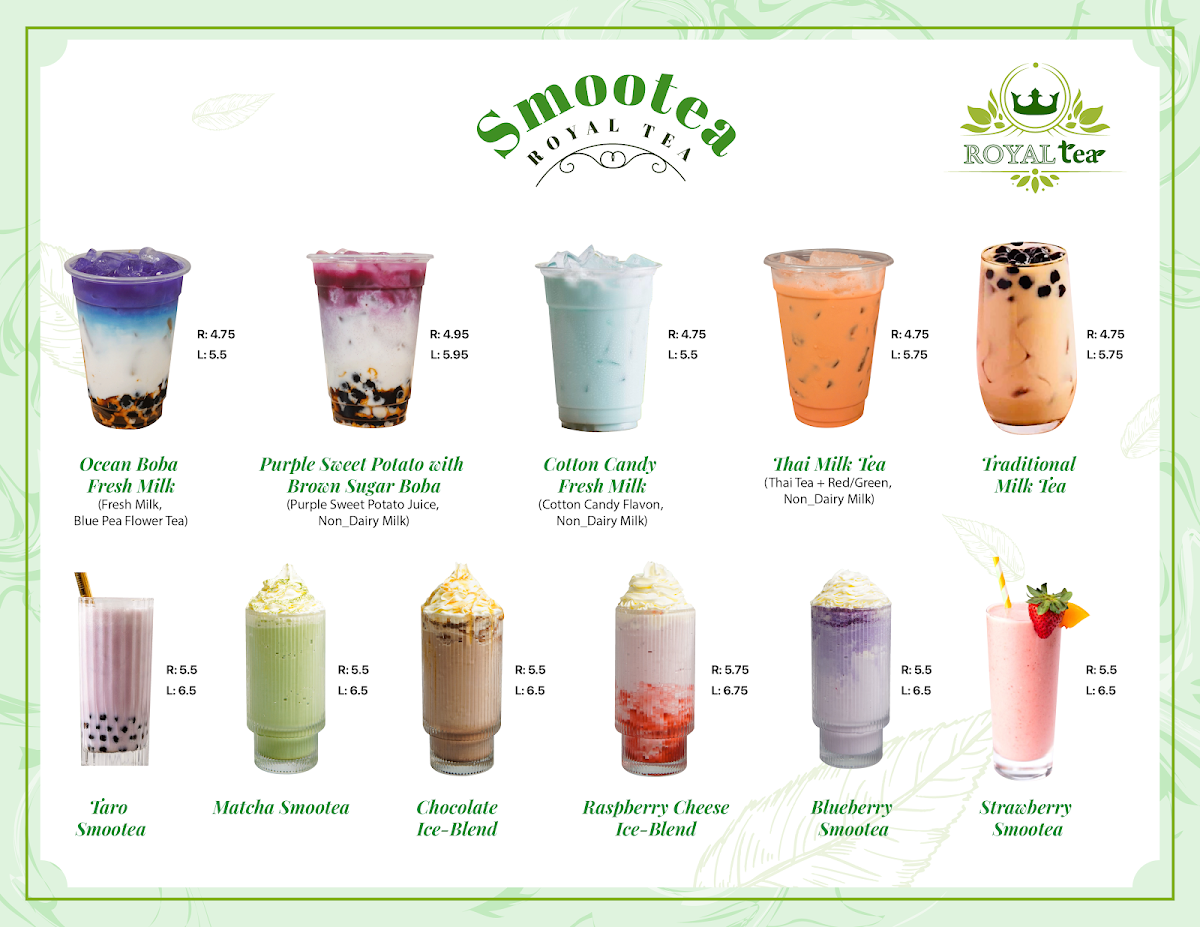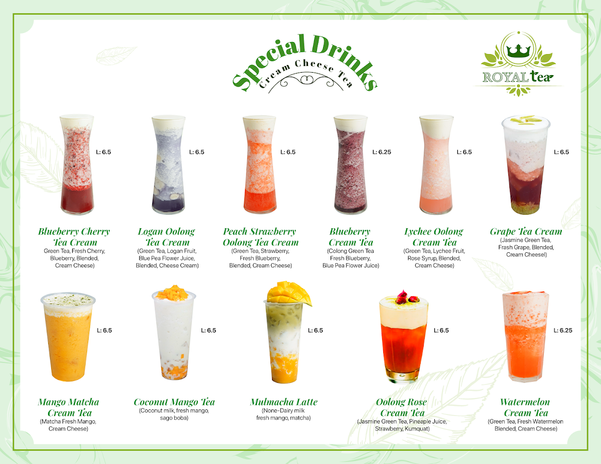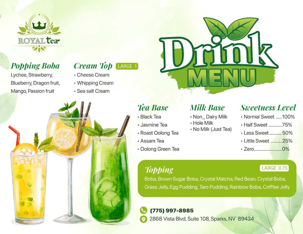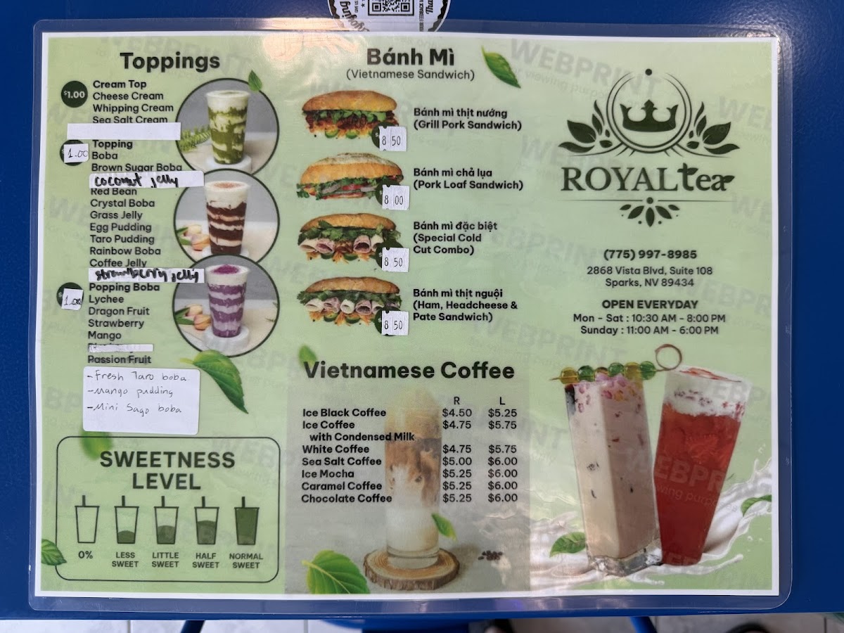 Dining at Royal Tea on Vista Blvd in Sparks offers a diverse and visually appealing menu that caters to both traditional and adventurous palates. The Non-Caffein Milk Tea selection, featuring Honeydew Milk Tea, Strawberry Pastel Milk Tea, Banana Milk Tea, Fresh Taro Sago Pearl Milk Tea, and Coconut Milk Tea, delivers creamy, naturally sweet flavors ideal for those avoiding caffeine. For plant-based options, the Made With Non-Dairy Milk lineup includes Matcha Brown Sugar, Thai Tea Strawberry, Thai Green Tea Latte, Strawberry Matcha Milk Tea, and Mocha Strawberry, offering rich and innovative twists on classic milk teas. Smoothie enthusiasts can enjoy Strawberry Smoothies, Mango Smoothies, Raspberry Smoothies, Blueberry Smoothies, and Matcha Smoothies, each customizable with toppings like Whipping Cream or Sea Salt Cream. Fans of Vietnamese cuisine will appreciate the Bánh Mì selection, including Bánh Mì Thịt Nướng, Bánh Mì Chả Lụa, Bánh Mì Đặc Biệt, and Bánh Mì Thịt Nguội, providing authentic, savory sandwiches. Coffee lovers are covered with Vietnamese Coffee options like Ice Black Coffee, Ice Coffee, White Coffee, Sea Salt Coffee, and Ice Mocha. For tea connoisseurs, the Brulee Tea range features Cream Brulee Chocolate, Cream Brulee Matcha, and Cream Brulee Taro, while Tea Base choices such as Jasmine Tea, Roast Oolong Tea, Assam Tea, and Oolong Green Tea offer classic flavors. The Fresh Juice Tea collection, including Strawberry Orange Peach Tea, Orange Grape Fruit Morito Tea, Violet Spring Tea, Red Dragon Fruit Kumquat Tea, and Orange Green Tea, provides refreshing fruity alternatives. Finally, the Special Drinks/Cream Cheese Tea like Blueberry Cherry Tea Cream, Logan Oolong Tea Cream, Peach Strawberry Oolong Tea Cream, Blueberry Cream Tea, and Lychee Oolong Cream Tea, alongside other add-ons such as Boba, Grass Jelly, Egg Pudding, Taro Pudding, and Rainbow Boba, ensure a playful and customizable experience. Overall, the menu at Royal Tea combines traditional Vietnamese flavors with modern twists, appealing to a wide variety of tastes and preferences.