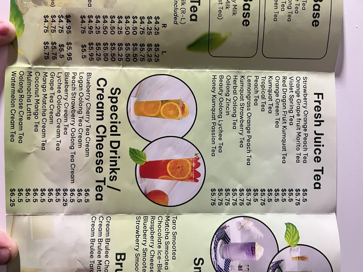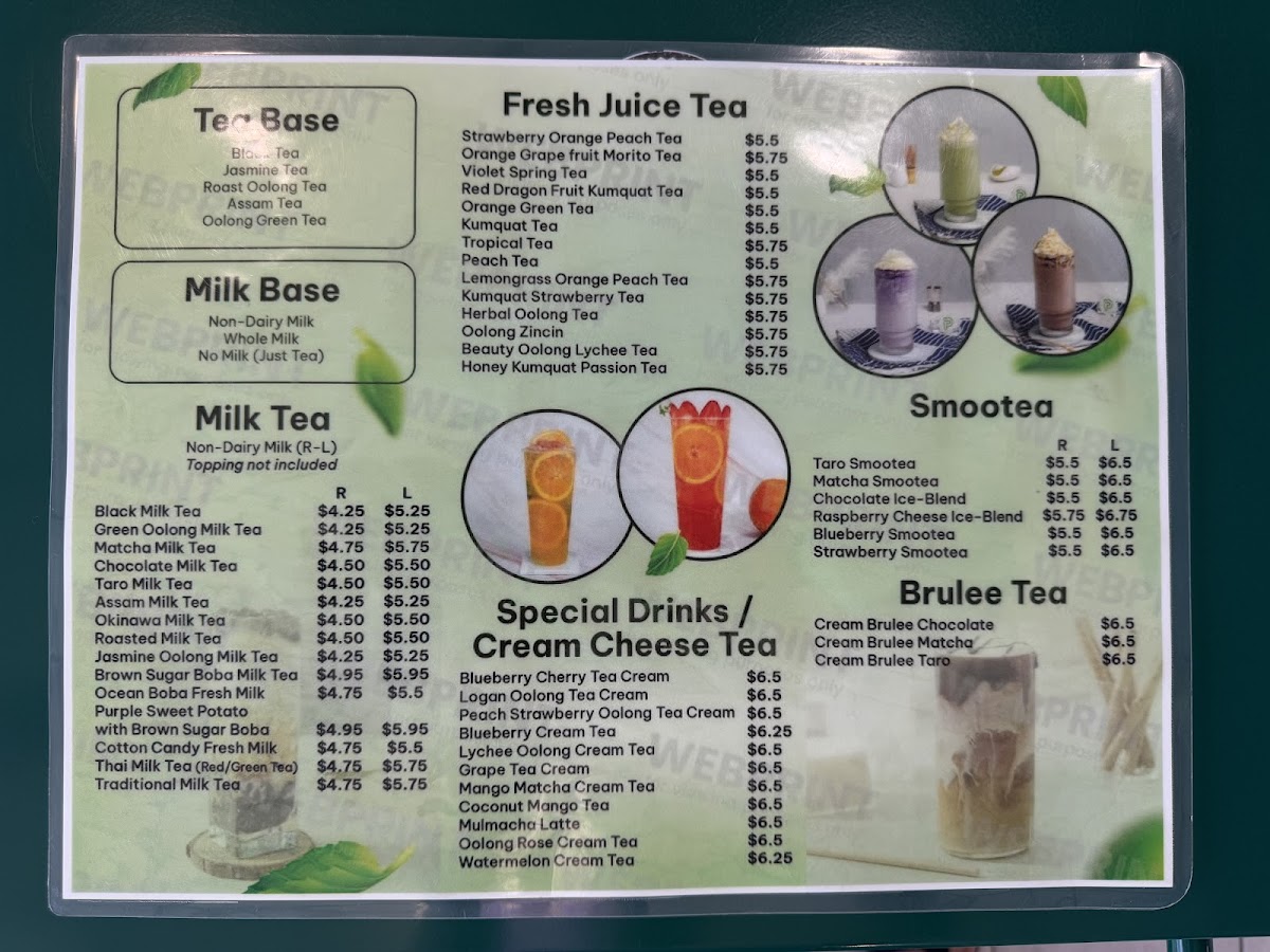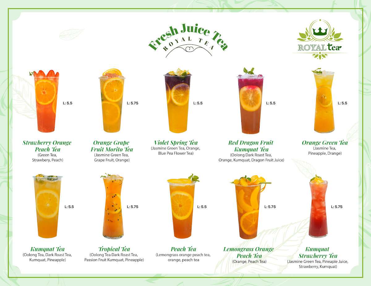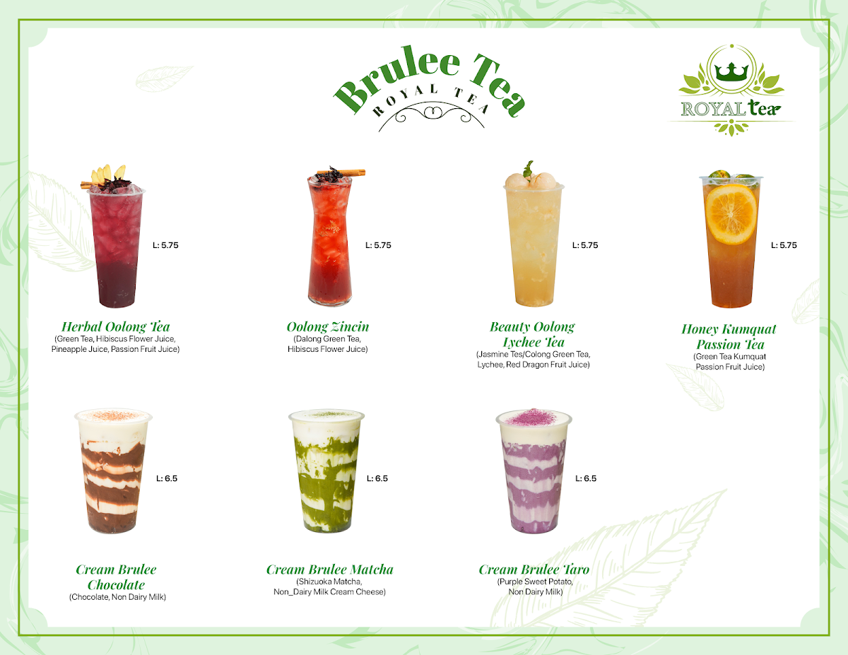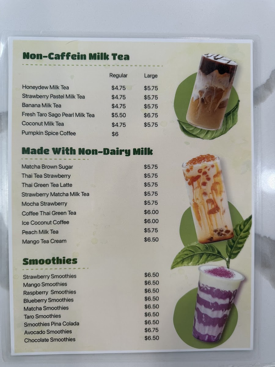 Dining at Royal Tea on Vista Blvd in Sparks offers a diverse and visually appealing menu that caters to both traditional and adventurous palates. The Non-Caffein Milk Tea selection, featuring Honeydew Milk Tea, Strawberry Pastel Milk Tea, Banana Milk Tea, Fresh Taro Sago Pearl Milk Tea, and Coconut Milk Tea, delivers creamy, naturally sweet flavors ideal for those avoiding caffeine. For plant-based options, the Made With Non-Dairy Milk lineup includes Matcha Brown Sugar, Thai Tea Strawberry, Thai Green Tea Latte, Strawberry Matcha Milk Tea, and Mocha Strawberry, offering rich and innovative twists on classic milk teas. Smoothie enthusiasts can enjoy Strawberry Smoothies, Mango Smoothies, Raspberry Smoothies, Blueberry Smoothies, and Matcha Smoothies, each customizable with toppings like Whipping Cream or Sea Salt Cream. Fans of Vietnamese cuisine will appreciate the Bánh Mì selection, including Bánh Mì Thịt Nướng, Bánh Mì Chả Lụa, Bánh Mì Đặc Biệt, and Bánh Mì Thịt Nguội, providing authentic, savory sandwiches. Coffee lovers are covered with Vietnamese Coffee options like Ice Black Coffee, Ice Coffee, White Coffee, Sea Salt Coffee, and Ice Mocha. For tea connoisseurs, the Brulee Tea range features Cream Brulee Chocolate, Cream Brulee Matcha, and Cream Brulee Taro, while Tea Base choices such as Jasmine Tea, Roast Oolong Tea, Assam Tea, and Oolong Green Tea offer classic flavors. The Fresh Juice Tea collection, including Strawberry Orange Peach Tea, Orange Grape Fruit Morito Tea, Violet Spring Tea, Red Dragon Fruit Kumquat Tea, and Orange Green Tea, provides refreshing fruity alternatives. Finally, the Special Drinks/Cream Cheese Tea like Blueberry Cherry Tea Cream, Logan Oolong Tea Cream, Peach Strawberry Oolong Tea Cream, Blueberry Cream Tea, and Lychee Oolong Cream Tea, alongside other add-ons such as Boba, Grass Jelly, Egg Pudding, Taro Pudding, and Rainbow Boba, ensure a playful and customizable experience. Overall, the menu at Royal Tea combines traditional Vietnamese flavors with modern twists, appealing to a wide variety of tastes and preferences.
